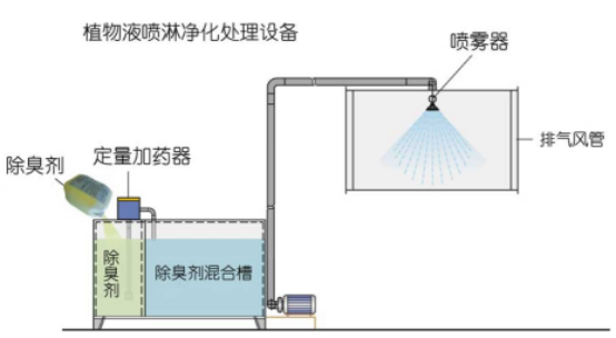 植物液经过自动加药系统配比稀释后,经高压雾化设备和管路系统输送至分布在废气控制区域现场的喷嘴,从而使植物液雾化成25微米粒径左右的细雾,通过吸收和吸附作用与臭气分子充分接触,同时增加臭气分子在植物液除臭剂的溶解度,然后充分与臭气分子发生一系列反应,生成无毒、无害的有机盐,达到彻底消除异味的目的。